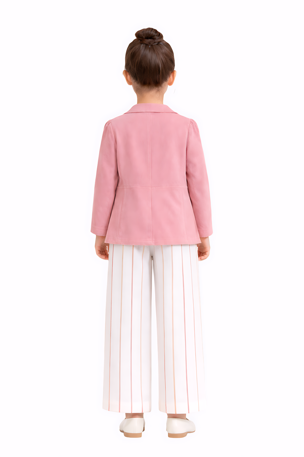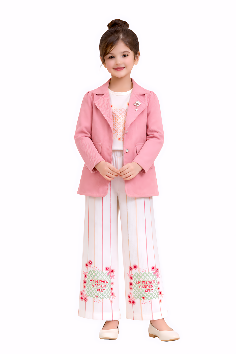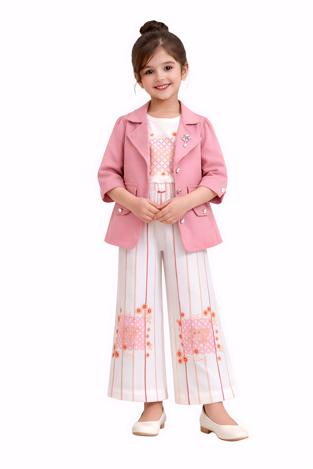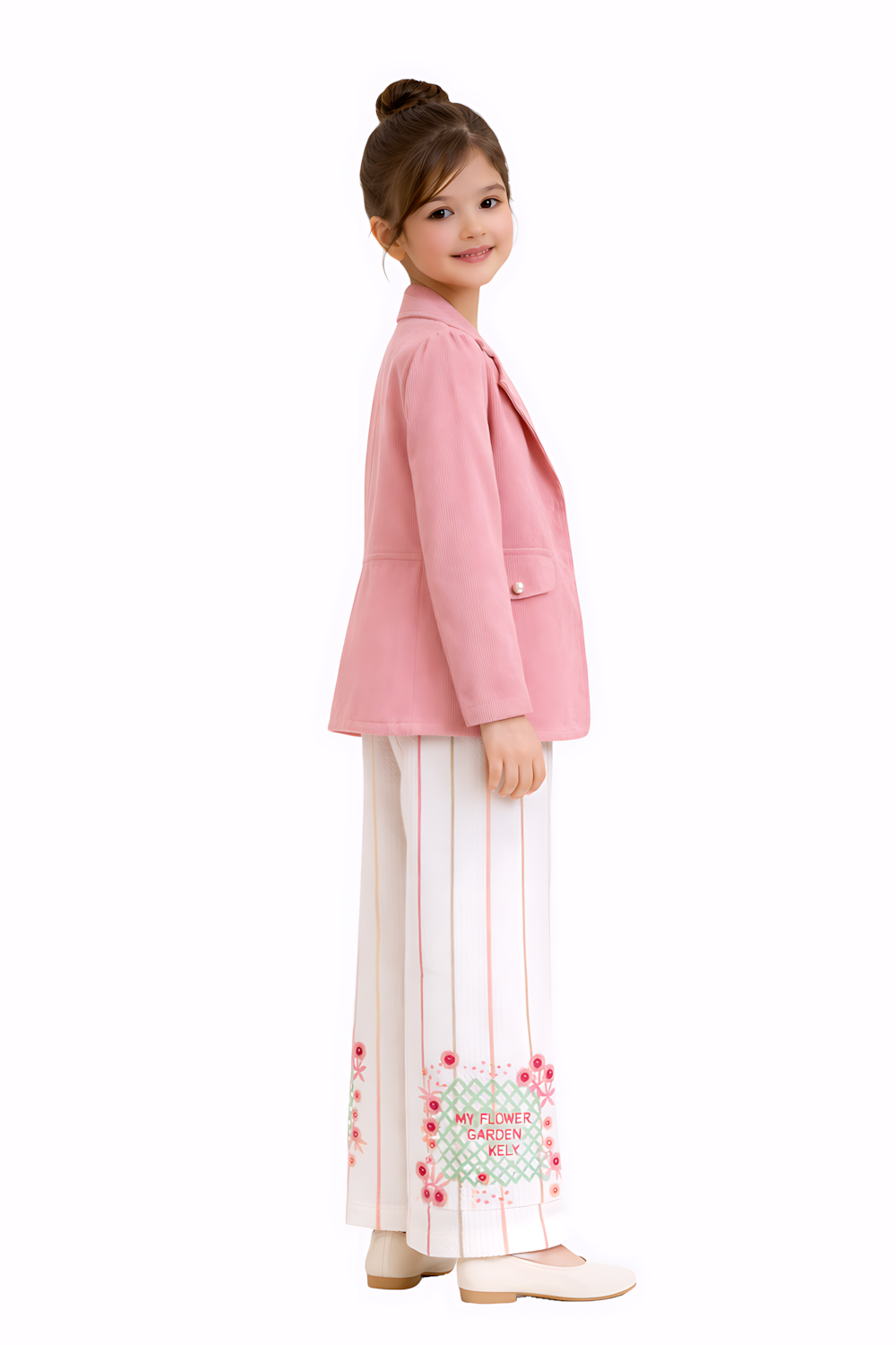 The Elora Garden Set – Blush Rose is a refined three-piece ensemble designed to make a statement. This set includes a floral detailed inner top, wide-leg embroidered trousers, and a tailored blush jacket that adds a structured, polished finish.