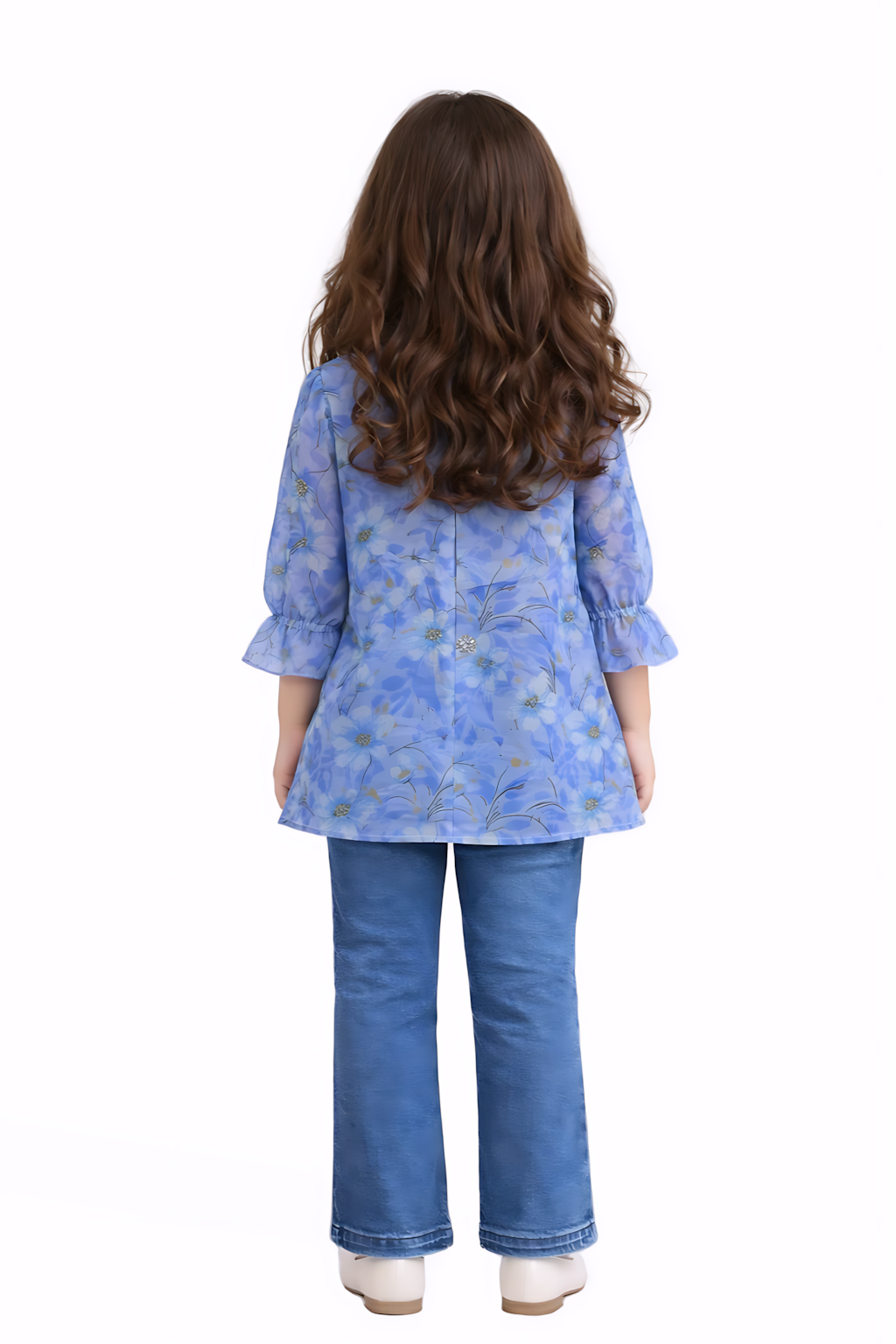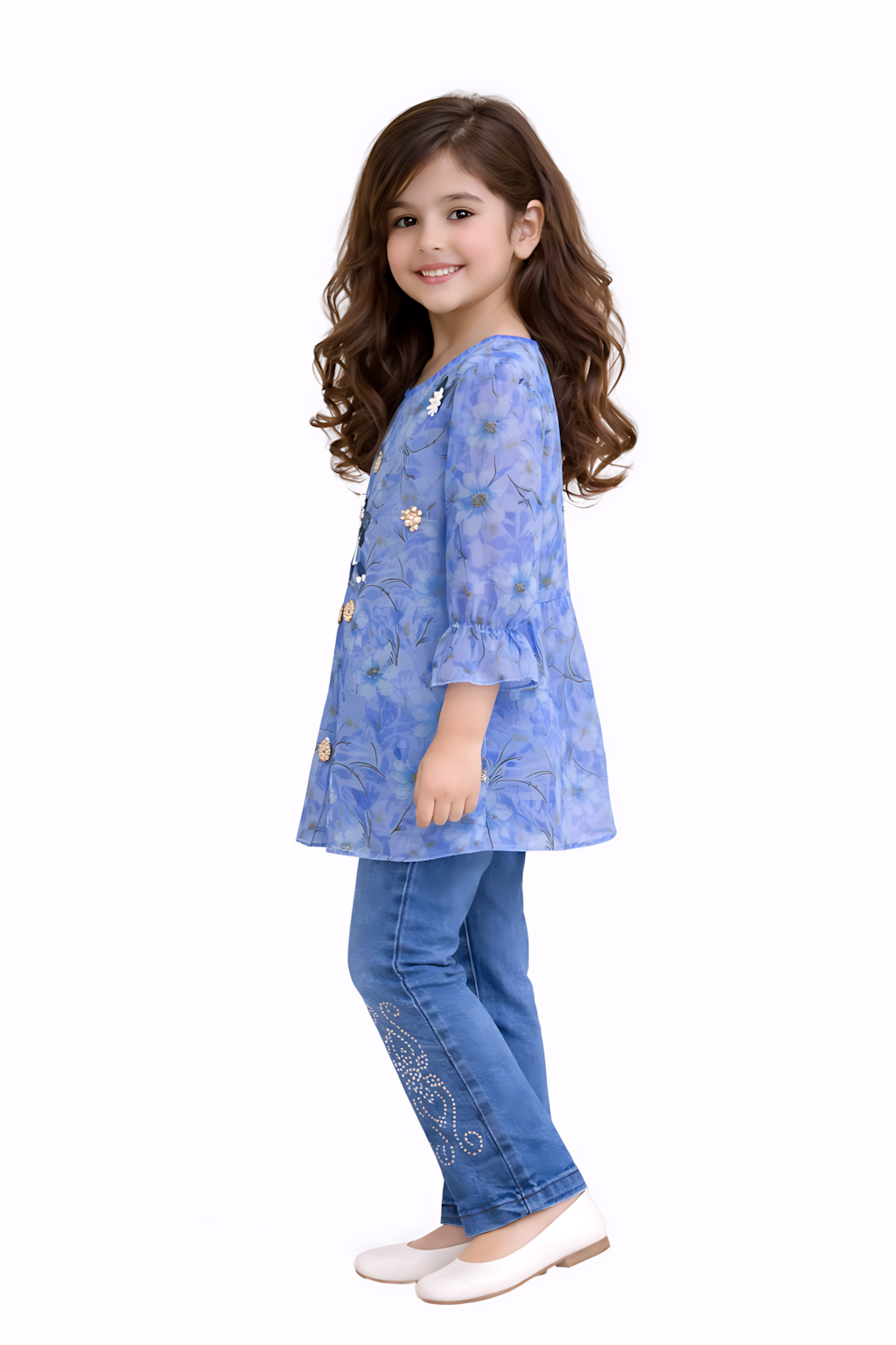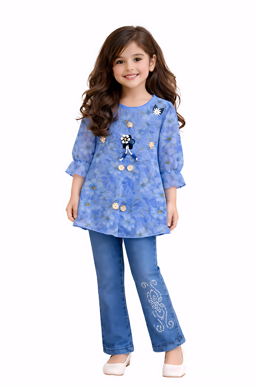 Let your little one shine in our Blue Blossom Girls 2-Piece Casual Set. Designed with comfort and elegance in mind, this adorable outfit features a soft blue floral kurti with delicate embellishment details, paired beautifully with trendy denim pants.