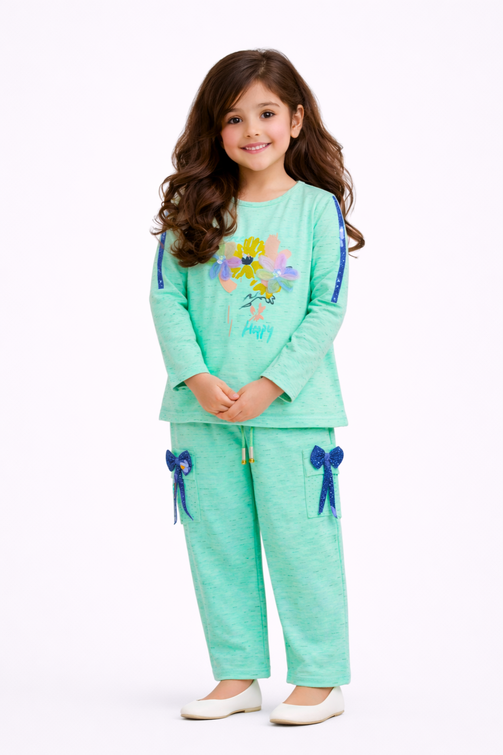 Brighten up her style with our refreshing Mint Meadow Bow Co-Ord Set. This charming outfit features a soft mint green top with a vibrant floral print and matching trousers enhanced with decorative bow pockets.